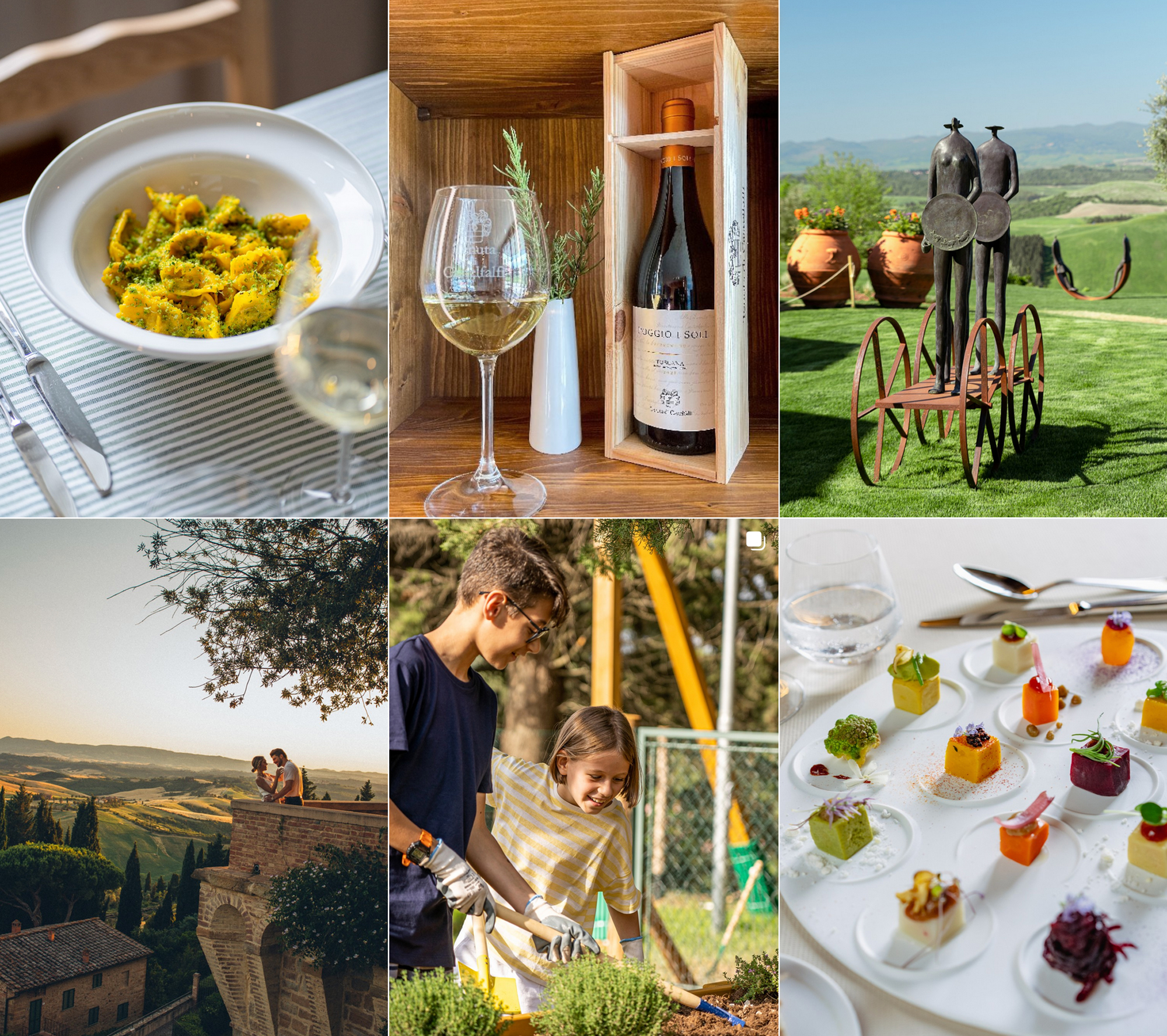 Dining ranges from the intimate, castle-perched La Rocca (panoramic fine dining) to casual trattoria pizzas and poolside salads, all showcasing the estate’s own wines and oils.