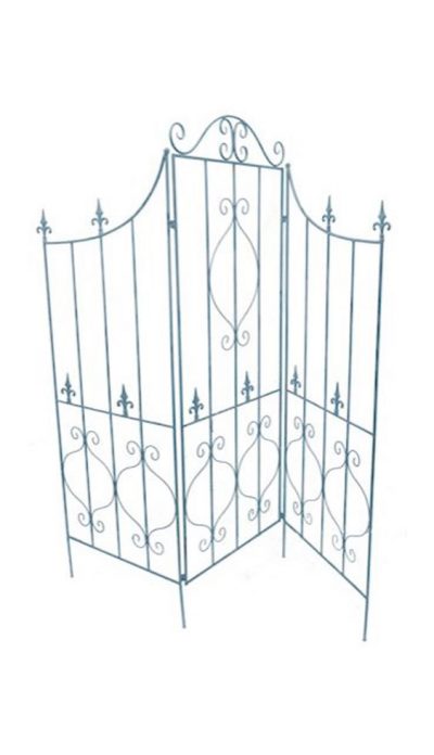 This lovely screen is the Gustav, by leading designers Ascalon Design of Hereford. It is a piece of artwork that combines scroll and fleur-de-lys details that curve and sweep in natural style to ornament perpendiculars. It has three panels, hinged to make the screen free-standing, and looks great on its own or festooned with plants.