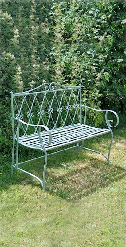This charming wrought iron bench is perfect for adding a little chateau chic to your home or garden. Those classic curves, French lattice back and charming shade of sage green make an enticing and eyecatching focus in the garden—a pleasing design to improve the vista in many styles of garden or patio, town or country, modern or classical.