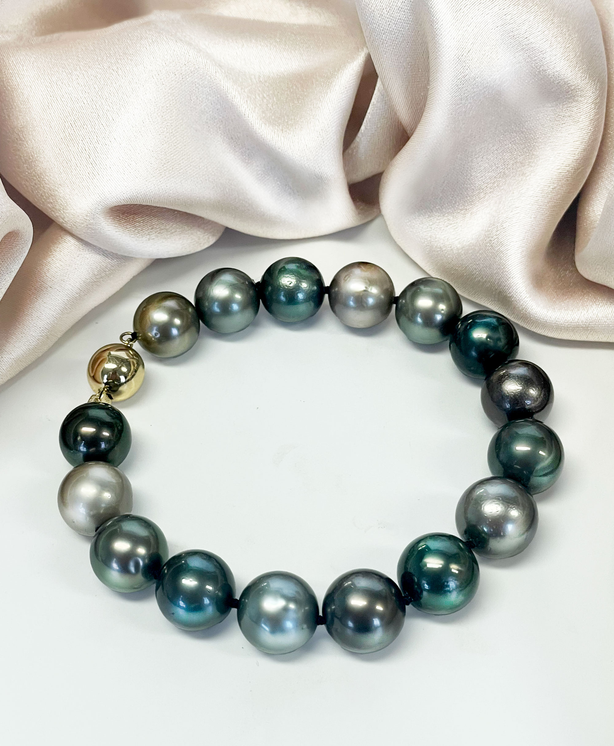 Our latest arrival at CountryClubuk is the Midnight Harmony Bracelet, a limited-edition piece featuring 16 uniformly 12mm natural Tahitian South Sea pearls. Hand-selected for bold size, high lustre, and authentic natural character—including subtle surface imperfections that affirm their organic South Pacific origin—these pearls embody the romance of distant island nights.