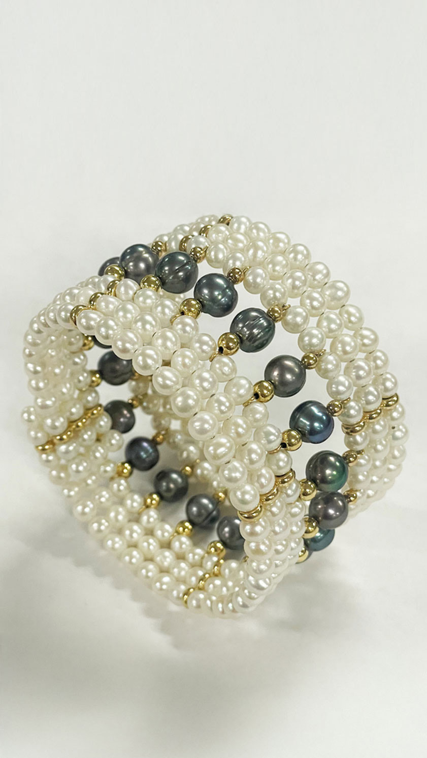 Elevate your wrist with this captivating natural pearl cuff bracelet, Ébène & Ivoire Symphony, a masterful blend of timeless elegance and modern contrast. Handcrafted with six lines of gleaming 5mm natural white pearls alternating seamlessly with a single line of 20 bold 7mm natural black pearls, this seven-row cuff creates a striking monochrome symphony—reminiscent of classic Tahitian-inspired designs yet distinctly sophisticated.