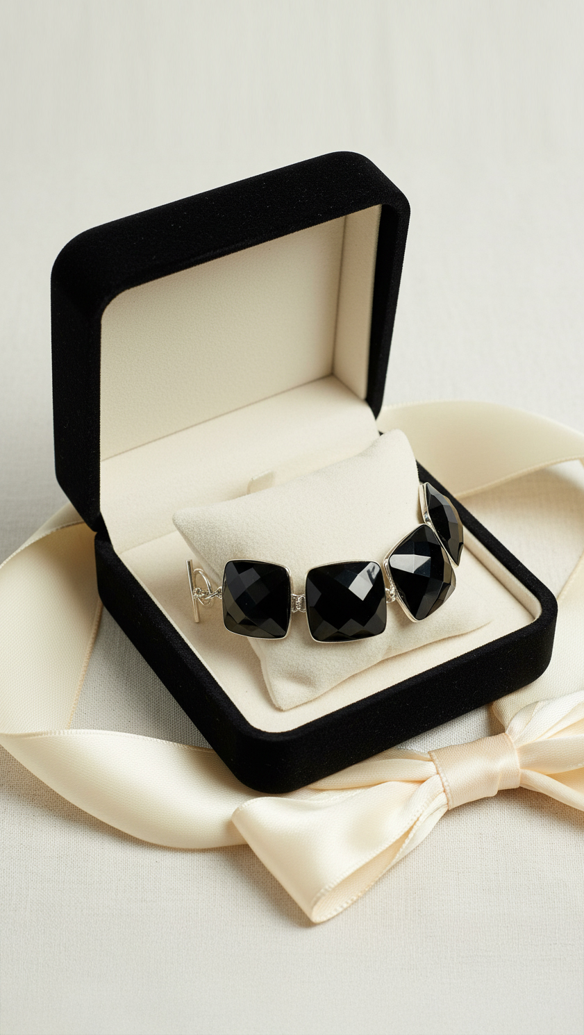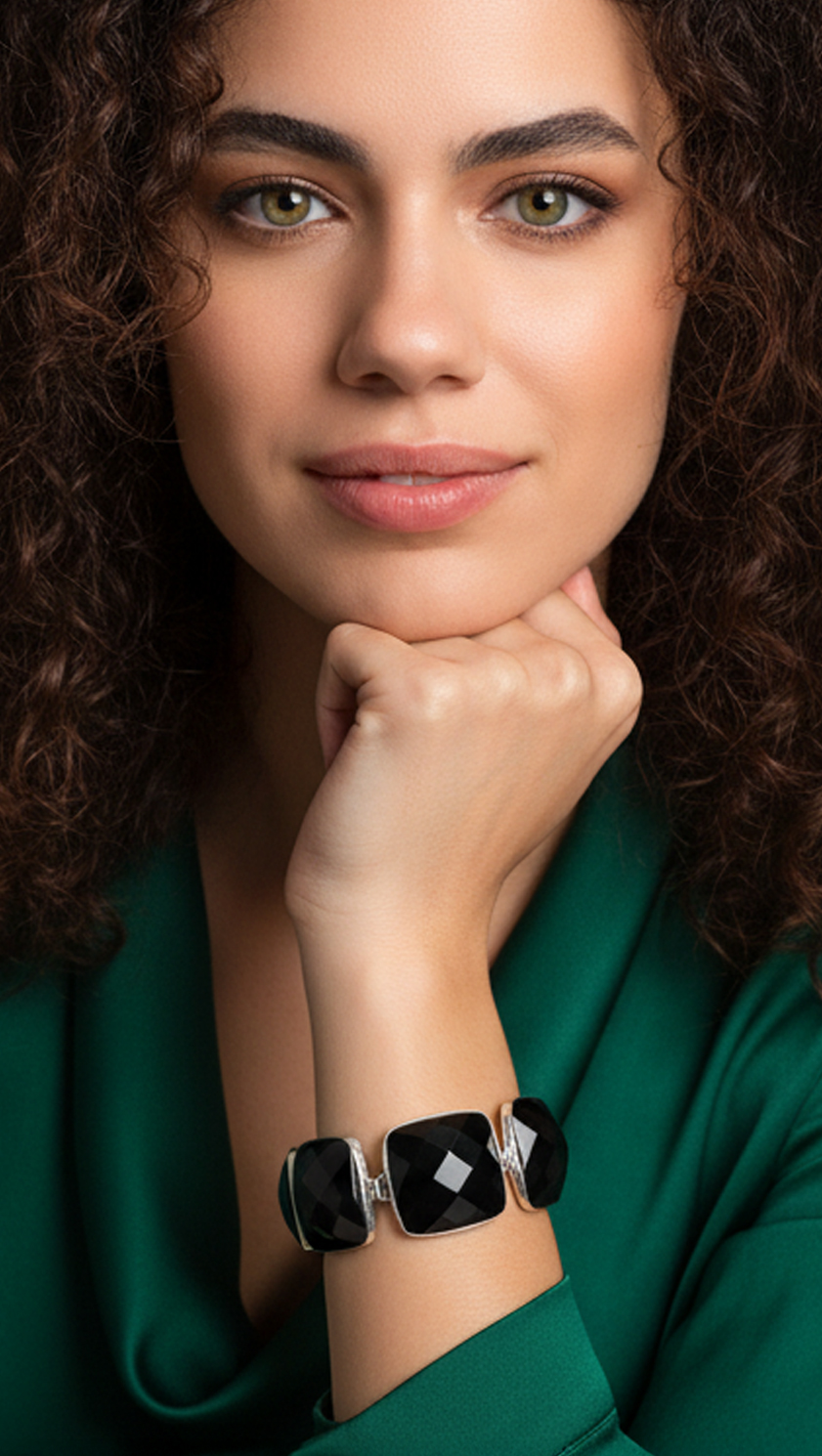 The monochrome palette—rich black onyx against gleaming stainless steel—offers effortless sophistication. It complements everything in your wardrobe: crisp white shirts and tailored black suits, soft grey cashmere, or the season’s brightest jewel tones. Discreet enough for the boardroom yet eye-catching enough for evening, the Noir Pyramid Bracelet moves seamlessly from workday to weekend, city meetings to country-house lunches.