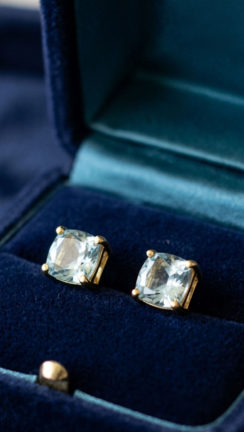 - Gemstones: Pair of natural aquamarine, 7mm cushion/square cut with beautiful serene ocean colour and excellent clarity