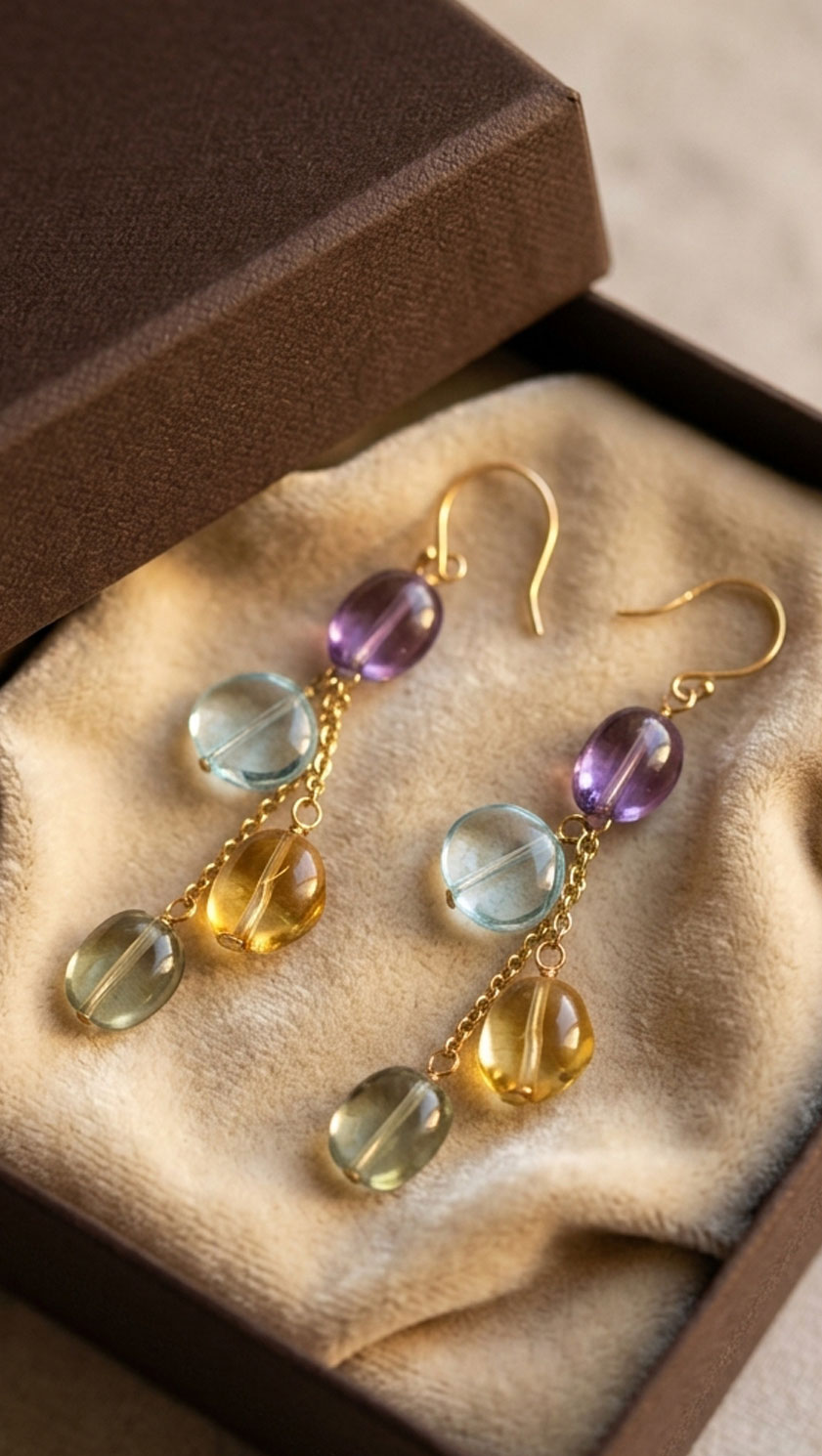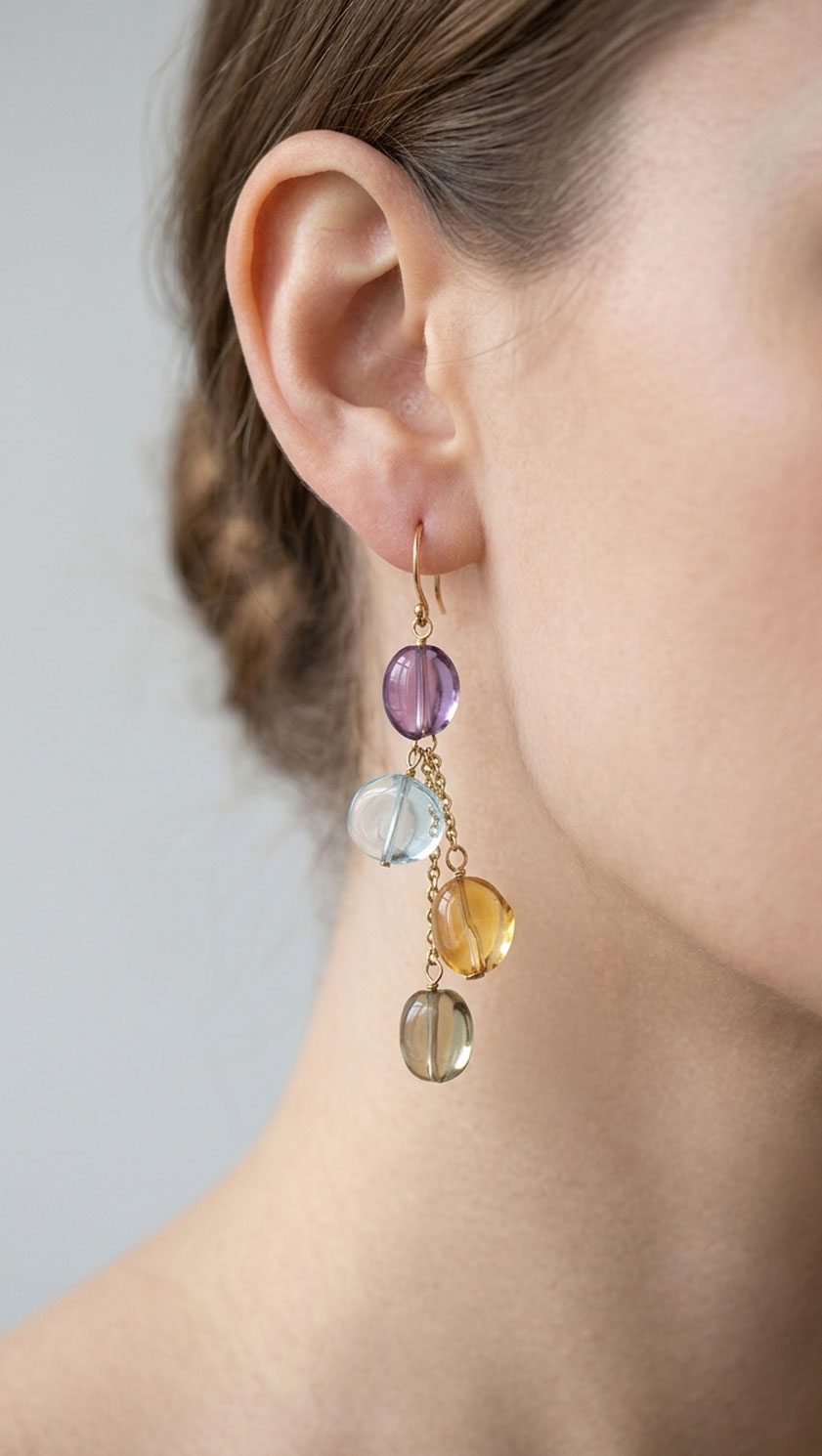 These exquisite 14ct gold dangle earrings feature a graceful cascade of natural gemstones—vibrant amethyst, sparkling aquamarine, warm citrine, and luminous lemon quartz—suspended on delicate gold chains.
