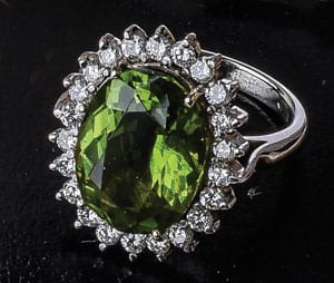 The sparkling faceted peridot weighs a full 12.33 carats, the high-quality diamonds are .72 carats, colour F, clarity VS.
