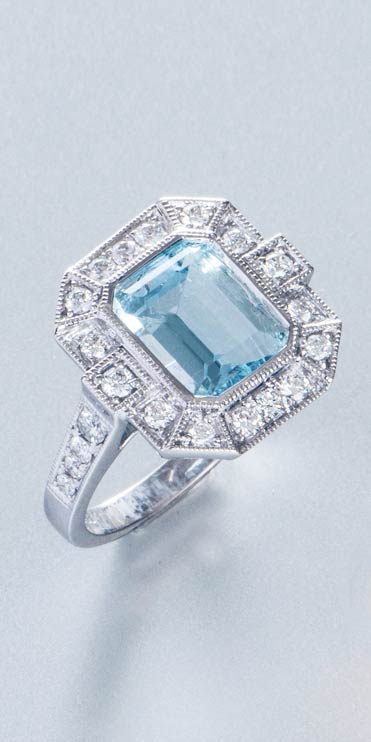 The liquid blue hues of a charismatic 2.6-carat aquamarine and diamond ring from London’s Hatton Garden