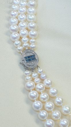 Elysian Sapphire Cascade Necklace—Three-Strand Natural Pearl Necklace with Sapphire & Diamond Clasp from the South Seas, Newly Arrived in the Odyssey Collection