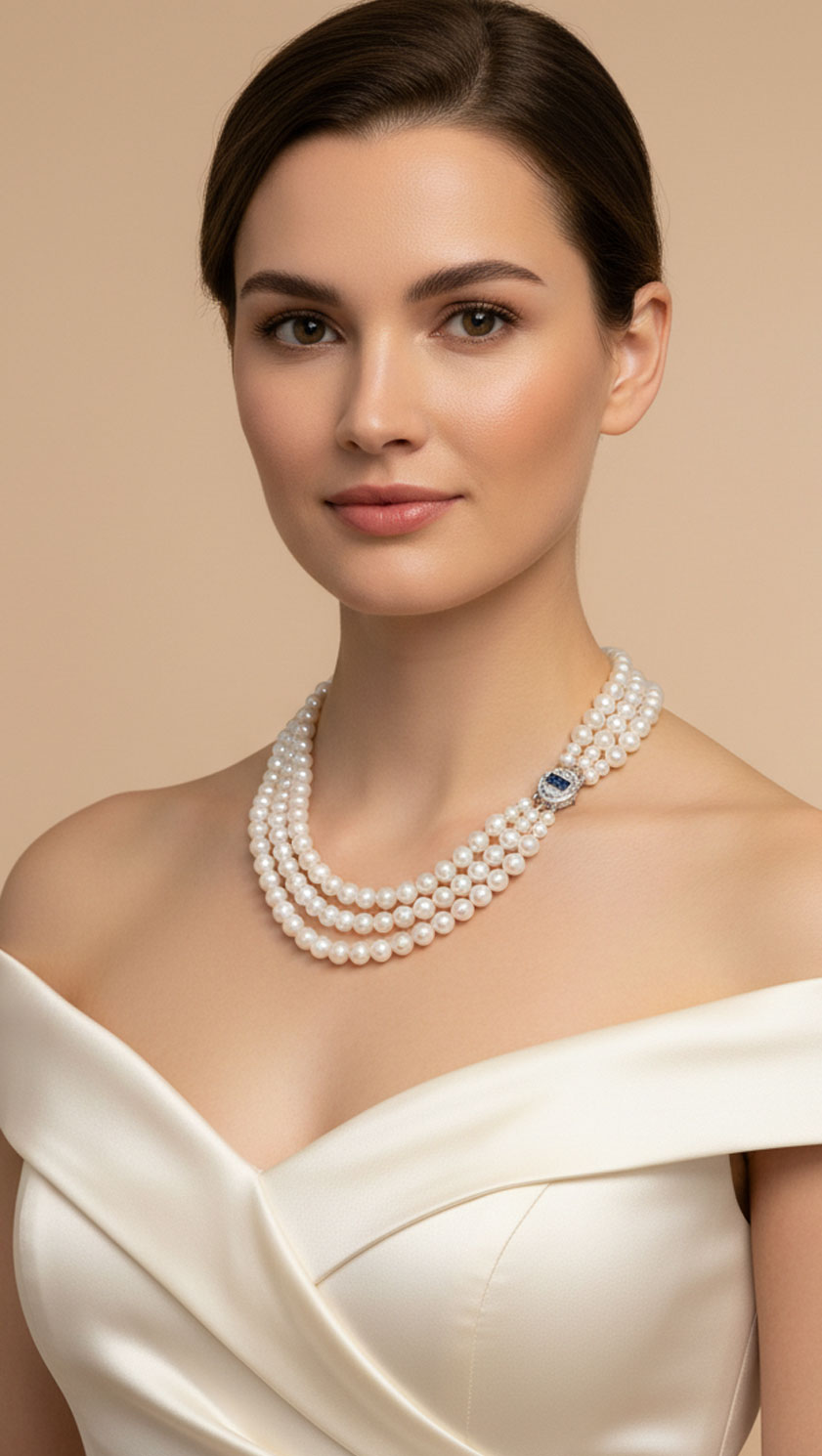 Hand-strung and individually hand-knotted in the classic tradition, the pearls drape with effortless fluidity, cascading softly against the skin and radiating that signature inner depth and iridescence that only high quality natural pearls can offer.
