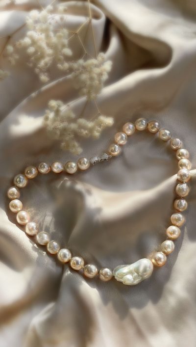This enchanting natural pearl and 14ct gold necklace from the South Seas has just arrived, and it is so beautiful. Named the Rosmira, it features a large, lustrous natural baroque white pearl showcased within a strand of gleaming champagne pearls, clasped with a handcrafted white gold and diamond bow.