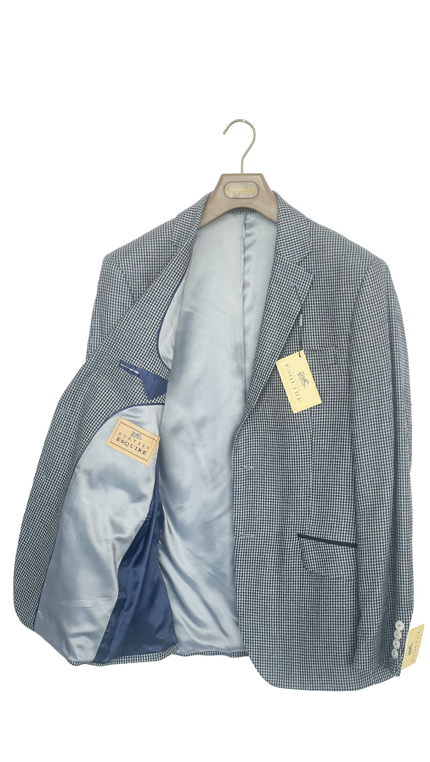 - Premium Italian silk-wool blend in a subtle indigo micro-check