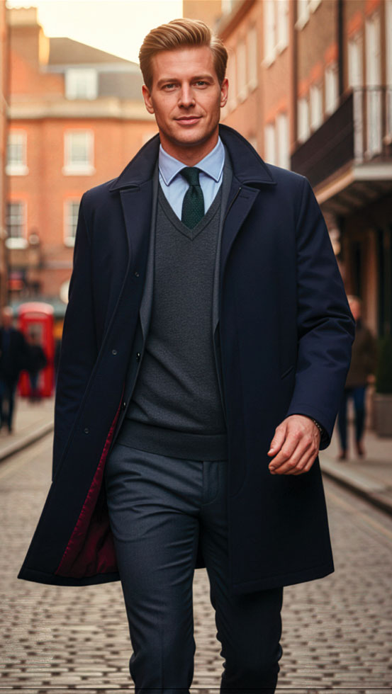 The clean single-breasted cut, concealed zip fastening and curved welt pockets create a streamlined silhouette that layers easily over suits and jackets. Thoughtful touches—adjustable cuff tabs, under-collar wolfhound embroidery and branded hardware—add quiet distinction.