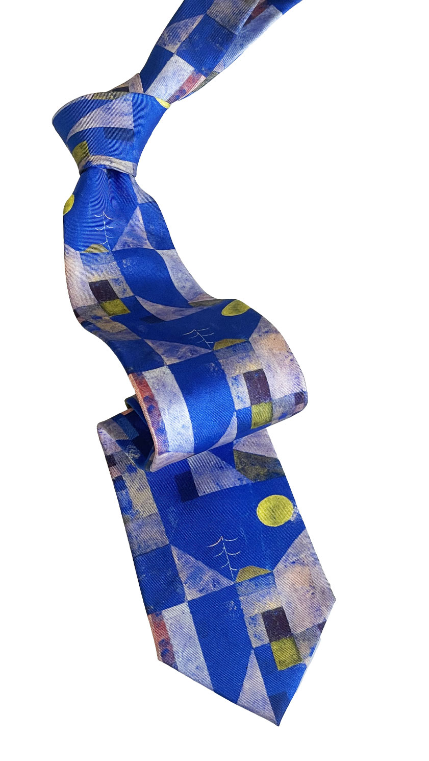 The Moonshine Silk Tie by Fox & Chave beautifully captures that balance. Inspired by the visionary modernist painter Paul Klee, the design reflects the artist’s fascination with colour, rhythm and dreamlike landscapes. Deep cobalt blues create a tranquil night sky across the silk, punctuated by geometric forms that suggest distant hills and abstracted architecture. At the centre glows a soft golden moon, lending the piece both warmth and quiet intrigue.