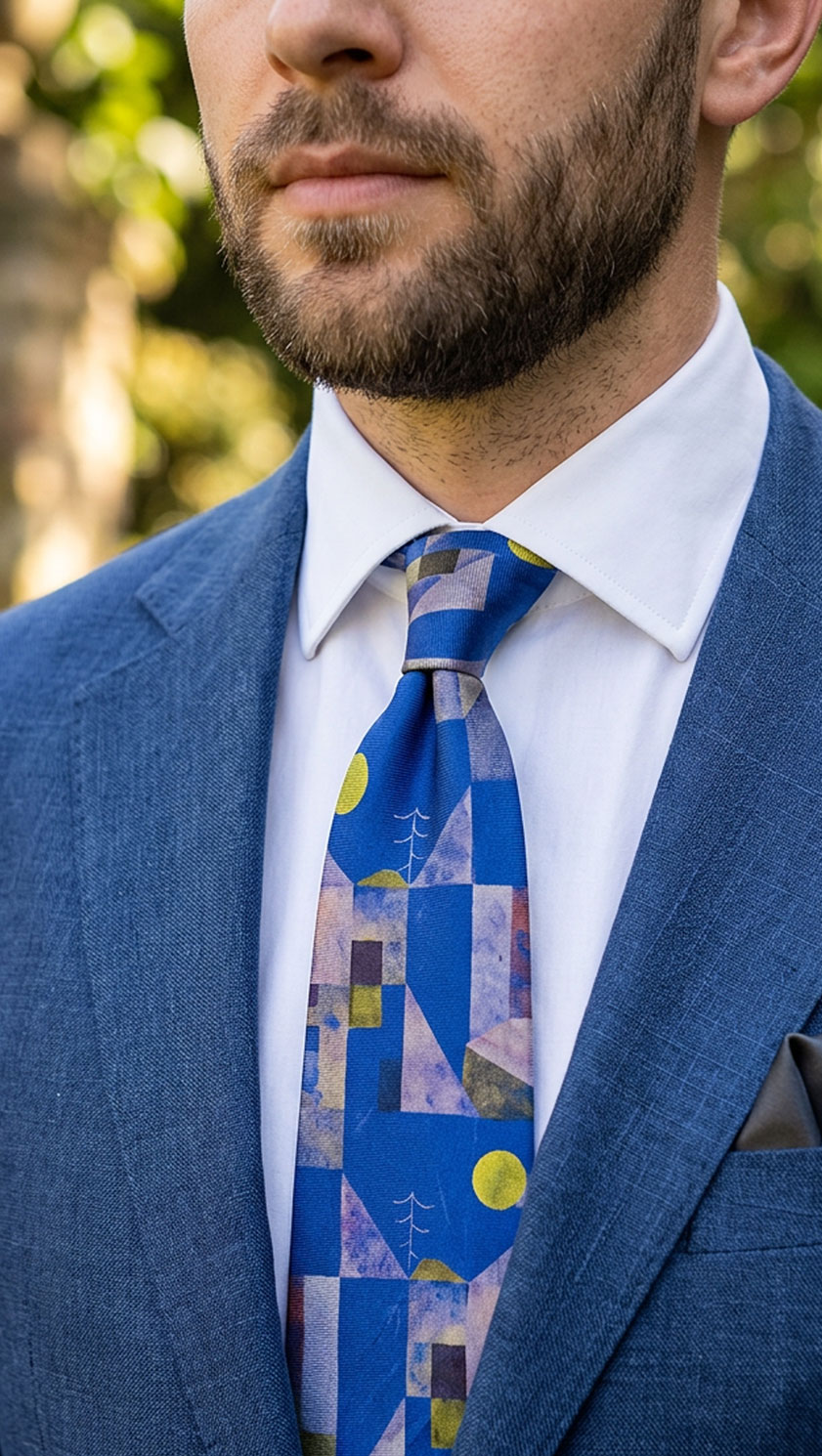 For those who appreciate both fine art and elegant dressing, this piece brings the two worlds together. The Moonshine tie allows the discerning gentleman to carry a hint of modernist creativity into everyday life—quietly distinctive, cultured, and unmistakably stylish.
