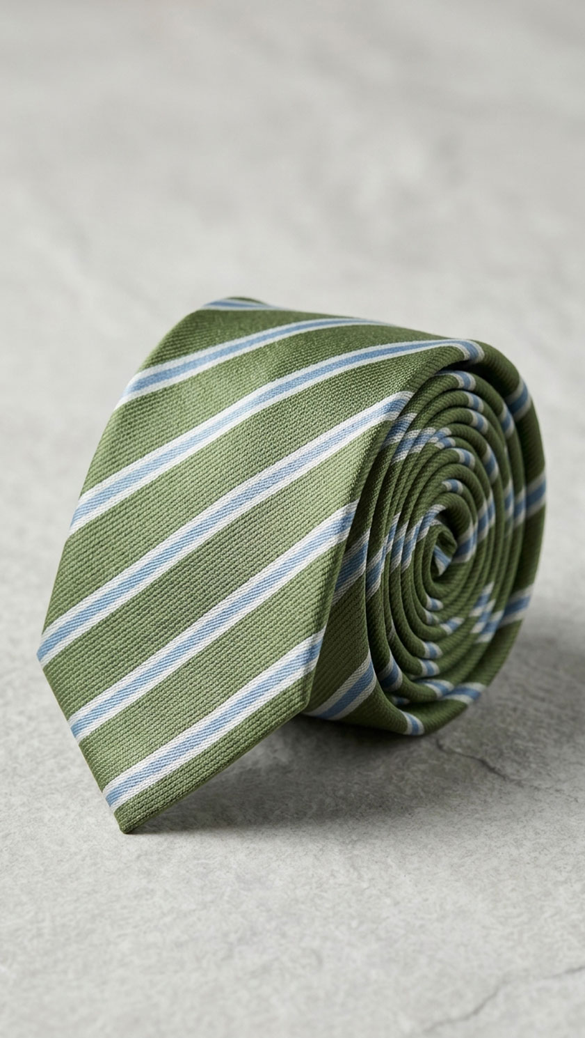 Enhance your tailored wardrobe with this sophisticated sage green striped pure silk tie, featuring crisp sky blue and white diagonal stripes. Expertly crafted from 100% pure silk, this Savile Row-inspired striped tie delivers a fresh, refined look perfect for Spring/Summer 2026.