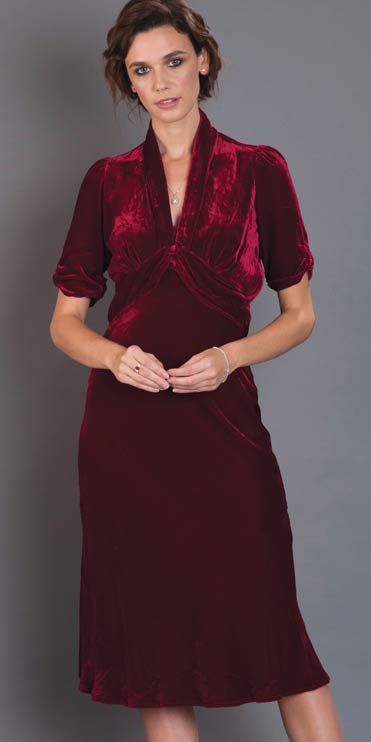 The Olivia dress in a whimsy of lace a contrast lining. The effect—with its Forties neckline, lace shawl-style collar and scalloped lace hem—is one of English romance with Italian style from designers Nancy Mac.
