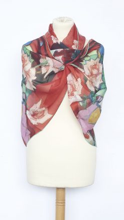 This lightweight 100% silk chiffon piece (180cm x 52cm, hand-rolled hems) bursts with bold, vibrant colours: expressive pink roses, emerald greens, deep blues, and warm yellows in flat, confident brushstrokes that capture the Scottish Colourists’ revolutionary use of colour and light.