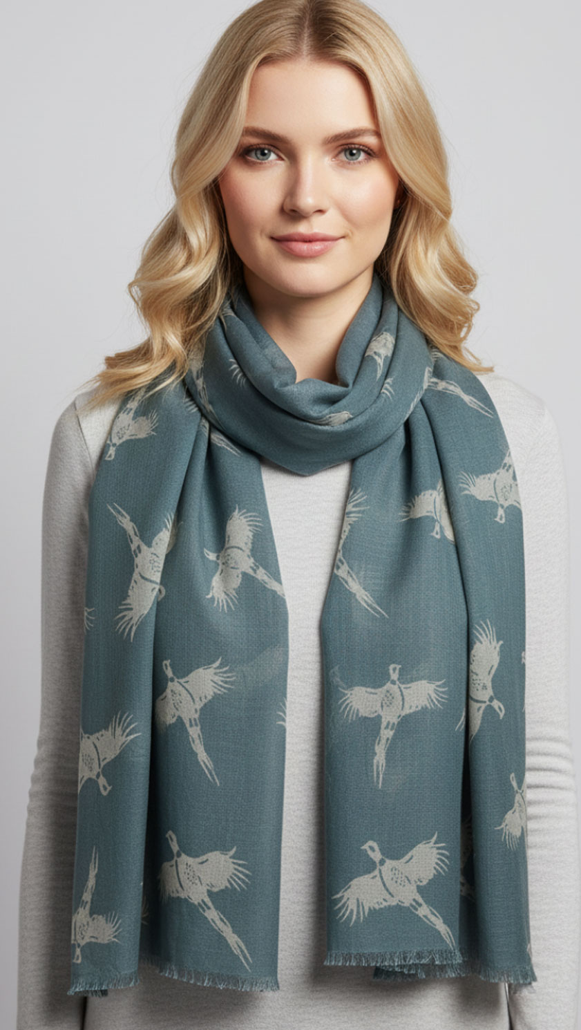 An elegant design of flying pheasants in ecru on a lovely shade of teal creates this fabulous cashmere and fine wool High Pheasants Scarf—a perfect design for your favourite Top Gun (the lady, of course), and for all who enjoy sport in particular and the countryside in general.