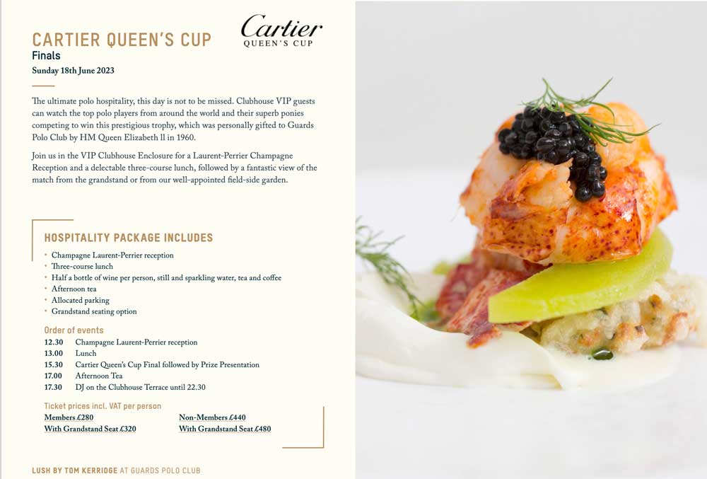 Join us for the Cartier Queen's Cup 2023 at Guards Polo Club, Windsor, jewel in the crown of the English Season, with a Champagne Laurent-Perrier Reception and delicious Three-Course Lunch by celebrated Two Michelin Star chef Tom Kerridge