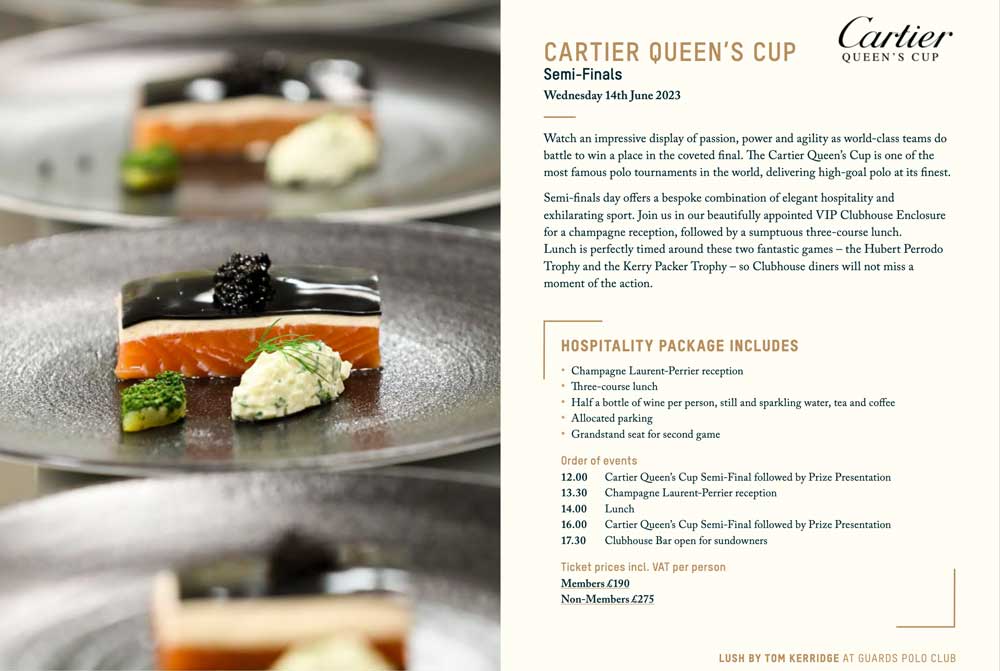 The Cartier Queen’s Cup is polo at its best. It is always a thrilling sporting occasion—the Semi-Finals offer a fabulous day of the greatest sporting challenges; the Finals offer a sensational climax, as well as one of the social highlights of the year. Players and aficionados travel across the world to be there, and we shall enjoy a full day of sport, including grandstand seats and wining and dining in Guards Clubhouse, tasting the new menus created by Lush by Tom Kerridge, the Michelin Star chef behind the new culinary delights at Guards.