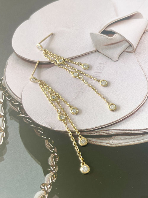 The natural brilliant cut diamonds catch the light and make the earrings dance. The gold chains on each earring are set with five diamonds, featuring a total of 10 round brilliant cut diamonds and a top diamond at the ear, adding up to 12 round brilliant cut natural diamonds with a total weight of .35 carats beautifully set in a 14ct gold bezel setting.
